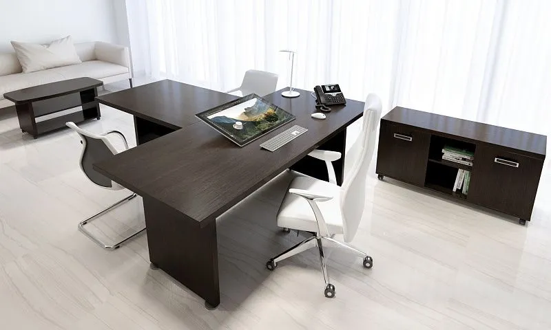 Массивные детали мебели, выполненные из плиты 38 мм. В производстве кабинета серии «Приоритет» используется экологически чистая ламинированная ДСП с меламиновым антибликовым покрытием толщиной 38 мм и 18 мм. Столешницы, топы и декоративные панели изготовлены из ЛДСП толщиной 38 мм, облицованы противоударной кромкой ПВХ 2 мм. Остальные детали изготовлены из ЛДСП толщиной 18 мм. Стекло матовое и прозрачное тонированное, толщиной 4 мм. Рамки стеклянных дверей – алюминий, матовой обработки.