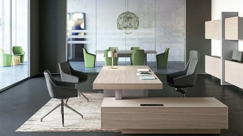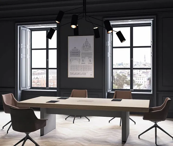 В модельном рядe Jera представлены прямоугольные переговорные столы двух размеров: 210х120 см и 280х120 см; Поверхность стола из МДФ покрыта пленкой ПВХ и полностью повторяет текстуру дерева. Кожа придает солидности и заостряет на себе внимание; Небольшой стол 210х120 см можно разместить непосредственно в самом кабинете руководителя для проведения бизнес встреч и собраний с сотрудниками; Столы также снабжены системой Top access, что позволяет быстро подключать аппаратуру и оргтехнику - таким образом скрыть провода и установить микрофоны, микшеры и другое оборудование для телеконферениций и презентаций так, что оно не будут вызывать визуальный дискомфорт и мешать рабочему процессу.